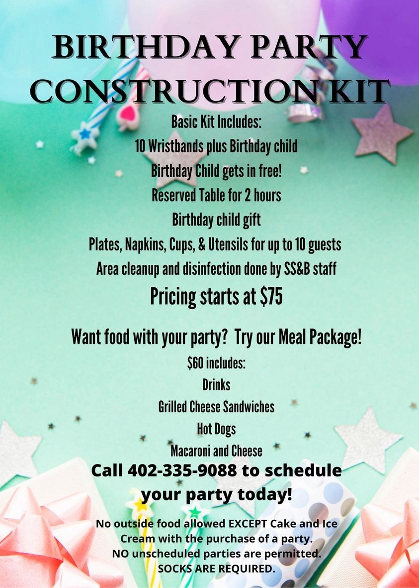 Our Birthday Packages start at $75. The Basic Birthday Package includes a free wristband for the birthday child, 10 wristbands for additional guests, a reserved table for 2 hours, and plates, utensils, and napkins for 10 people to use for any cake or ice cream you bring in!